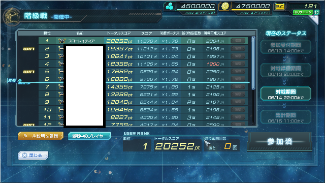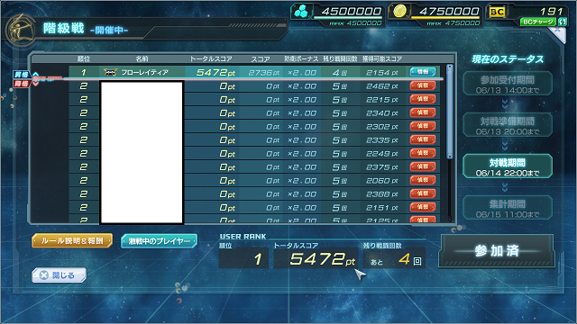 1戦目 win 破壊率 100% 攻撃スコア 2736