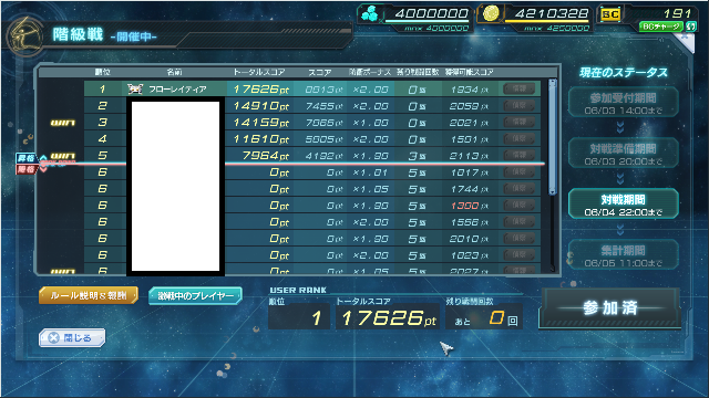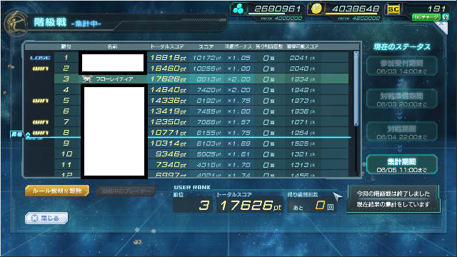 100%破壊されてしまったので、階級戦は前回の配置をそのまま手動で